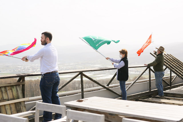 取材チーム一同、わけも分からぬままに着いていき、手に持たされたのは大きな旗!