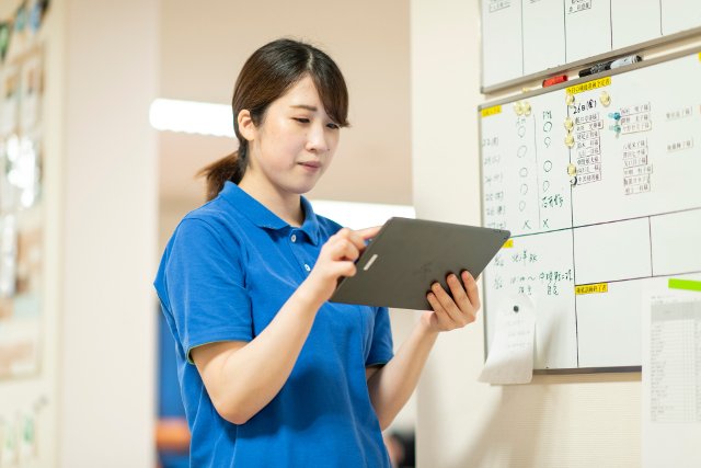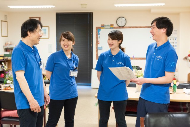一日の仕事を簡単に紹介すると「朝は出迎えとデータの記録。その後入浴の介助をします。お昼ごはんの後はフリータイム。リハビリのサポートのほか、ゲームの相手をしたりお話をしたり。16時には片付けが始まるので一日が過ぎるのはあっという間です」