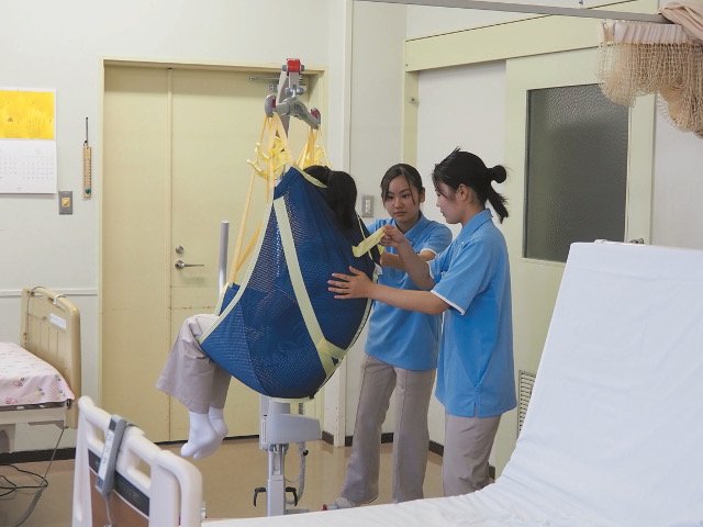 ベッドから車椅子へ移乗介助の技術を習得。介助現場で使われている移乗リフトの操作を学びます。
