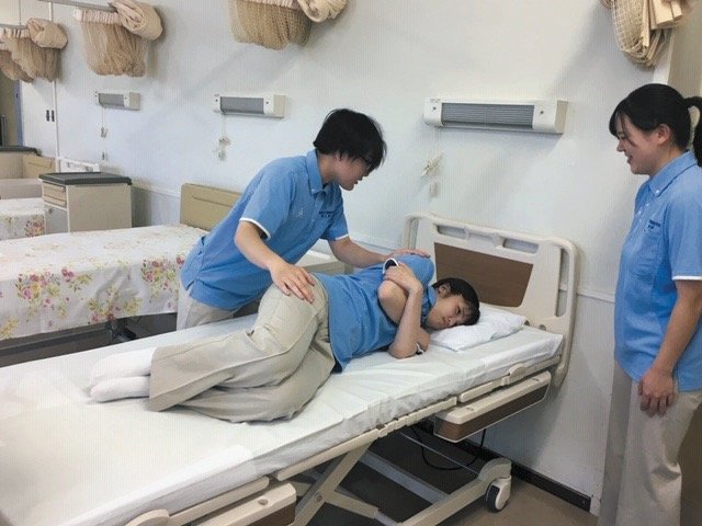 自分の力で体位を変えられない人を介助するために、相手にも自分にも負担の少ない体位変換の方法を学びます。