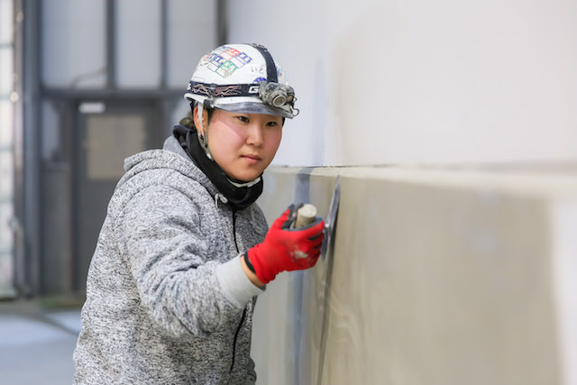 建設中の大きな倉庫の壁を、真っ直ぐに、スッとなぞる。その眼差しは真剣です。