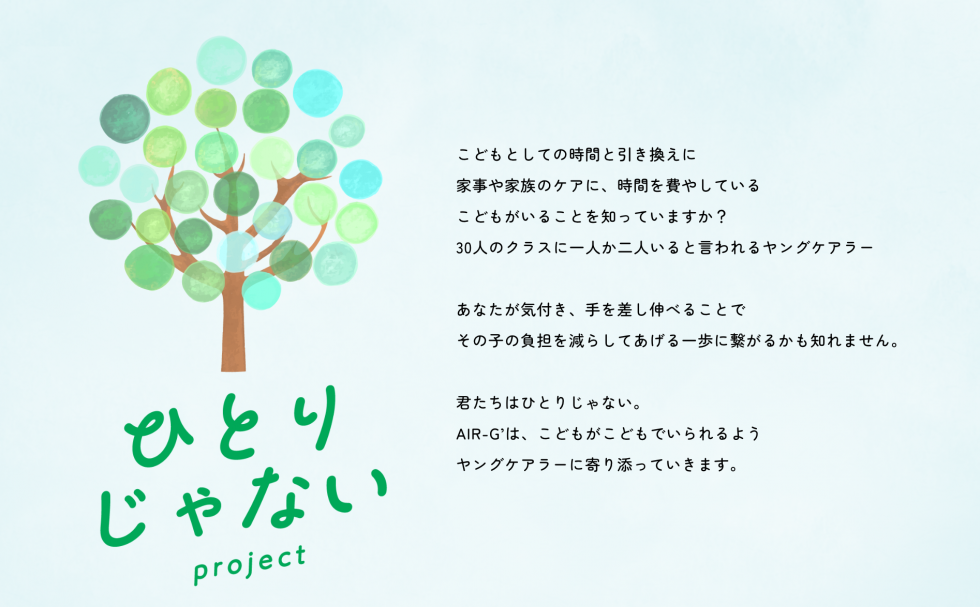 当サイトでも掲載している、AIR-G’(エフエム北海道)様では、ヤングケアラーを支援する「ひとりじゃないプロジェクト」に取り組んでいます。