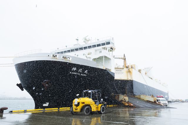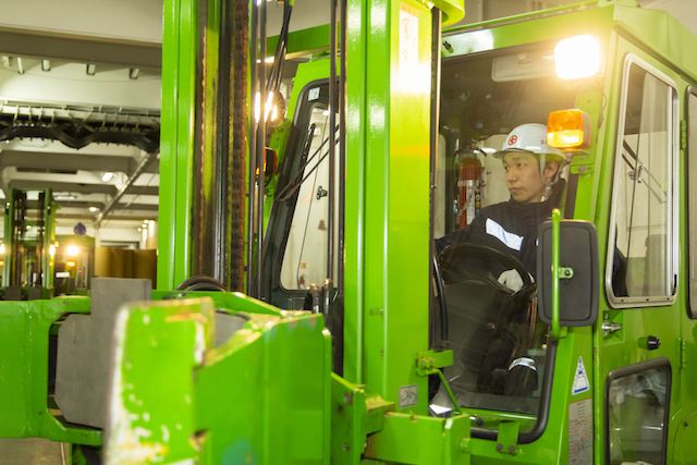 巨大な船舶内でフォークリフトを自在に操っているのが、今回お話を伺った齊籐瑞貴さんです。齊籐さんは、積み込み計画書に従い、トレーラーから荷物を船内に運び込んだり、フォークリフトやクレーンを駆使して巨大な資材を整理したりする業務を担っています。