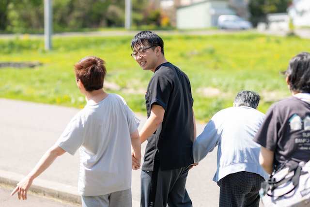 まろやかな空と、田園、山に囲まれた北海道深川市。このまちに障がい者支援施設あかとき学園があります。たっぷりと日差しが入り、開放感溢れるこの施設には、知的障がいや、精神障がいを抱える方達が「生活支援員」のサポートを受けながら暮らしています。その中心にあるホールを覗いてみると「カラオケ大会」の真っ只中!「金曜日の午後は毎週利用者さんが楽しみにしているんですよ」そう話してくれたのは、生活支援員の高橋洋貴さんです。ここ深川出身という高橋さん。地元の福祉業界で働くことは念願だったといいます。様々な年代、様々な性格、障がいを持つ利用者さんと向き合う中で、「心が通じた」と思える瞬間がなによりやりがいなのだとか。生活指導員として活躍する高橋洋貴さんのインタビューはこちらからご覧下さい。