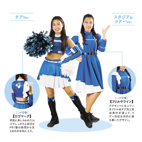 チア用は動きやすさ重視で、遠くから見ても球団コンセプトカラーのブルーが映えるデザイン。袖を通すと『やるぞっ』と気合が入ります!(桃子さん)」