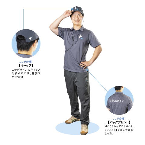 プロ野球が大好きなこともあり、エスコンフィールドの開業時から警備スタッフのバイトをしています。このユニフォームは、ファイターズ球団がデザインしてくれたもの。ホスピタリティや親近感が大切な仕事なので、一般的な警備員の制服に比べるとかなりカジュアル。そのおかげか、お客様から話しかけられる機会も多い気がします。サラッとした着心地も気に入ってます。