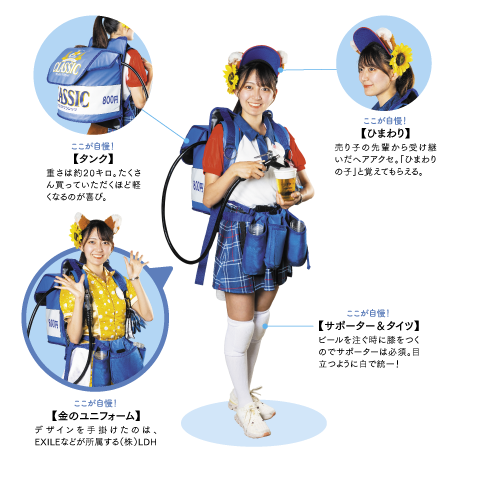 タンクを背負って販売していると「大変でしょ」と言っていただくことも多いのですが、お客様の笑顔や「ありがとう」の言葉を聞くと自然と頑張れてしまうんです。金のユニフォームは売上上位の売り子だけが着られる特別仕様。お客様にはビールだけでなく、「エスコンフィールドに来て楽しかった!」という思い出も一緒に提供できればと思っています!
