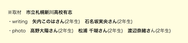 先日、札幌市立新川高校の生徒たちによる取材の様子をお届けしました📷