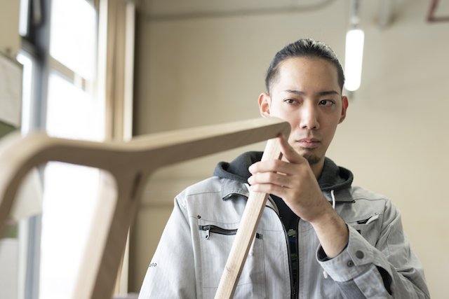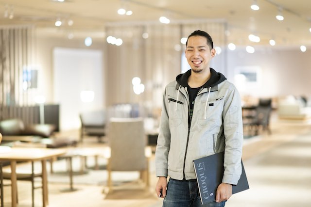 たくさんの家具とともに出迎えてくれたのは、家具の設計を担当する佐藤佑さん。少数精鋭の技術開発本部の中の若きホープです。デザイナーのイメージを形にするにあたり、技術的に「デザインの通りの形」を実現できるのか、安全性は大丈夫か、耐久性はどうか、家具として使用しやすいものか、などなど様々な角度から検討し、試作し、設計を行います。