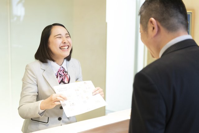 フロントでは、ひときわ明るい笑顔の女性がお客様に何かを説明しています。