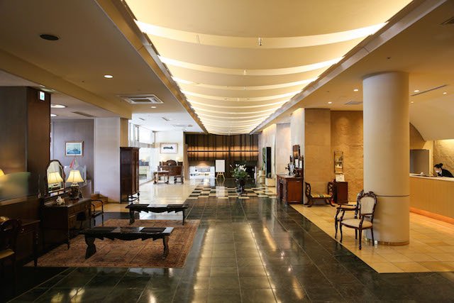 定山渓第一寶亭留翠山亭。高級感のある佇まいのエントランスとシックなロビー。